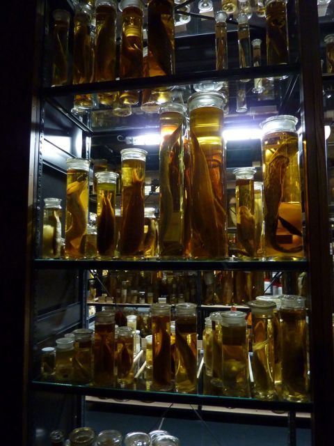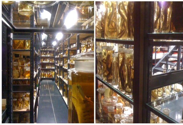 Quinze chercheurs et étudiants ont travaillé pendant un an pour réaliser une merveilleuse présentation dans un haute salle tout en verre et en métal. Des milliers de bocaux de toute dimensions, remplis d’animaux dont la couleur alterne entre le beige clair et l’ambre foncé, sont entreposés sur des étagères transparentes. Dans un silence quasi religieux, nous en faisons lentement le tour avec les autres spectateurs qui sont tout aussi émerveillés que nous.