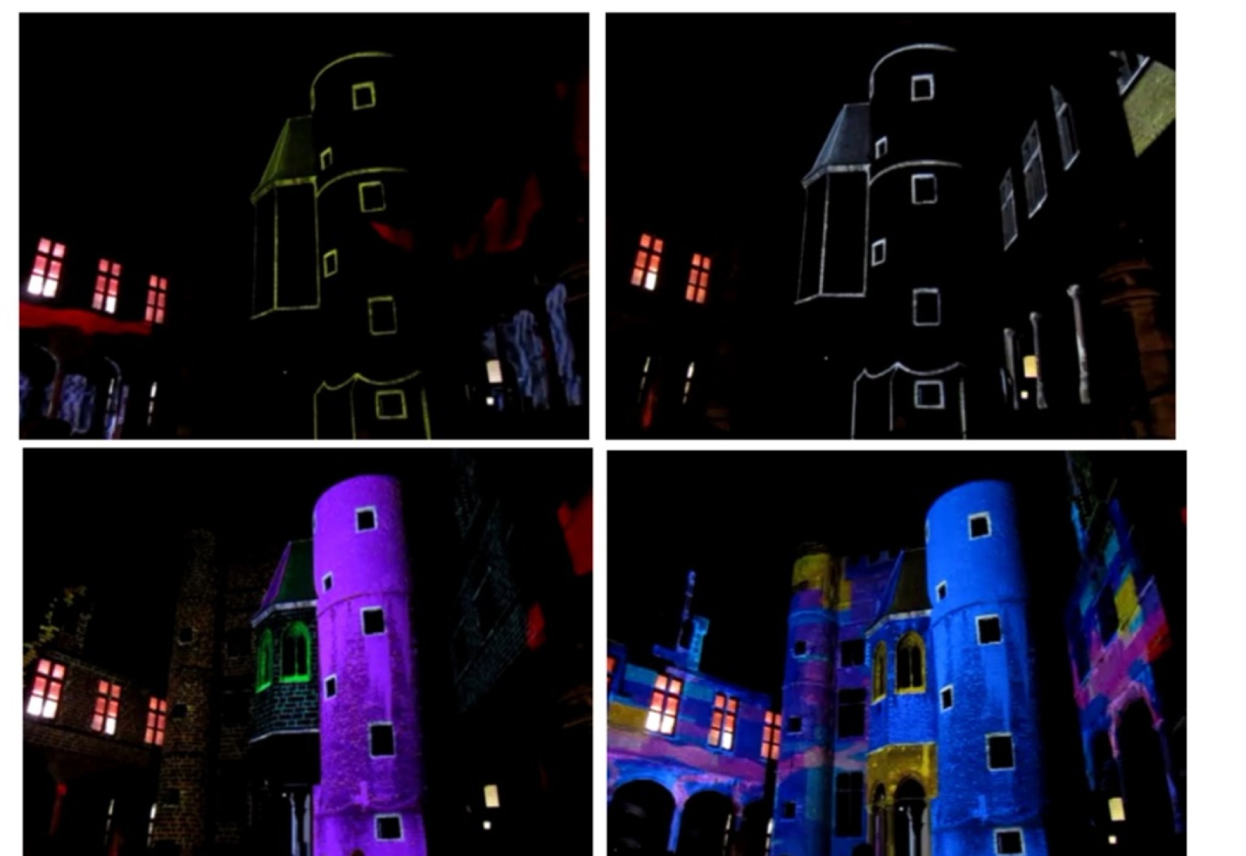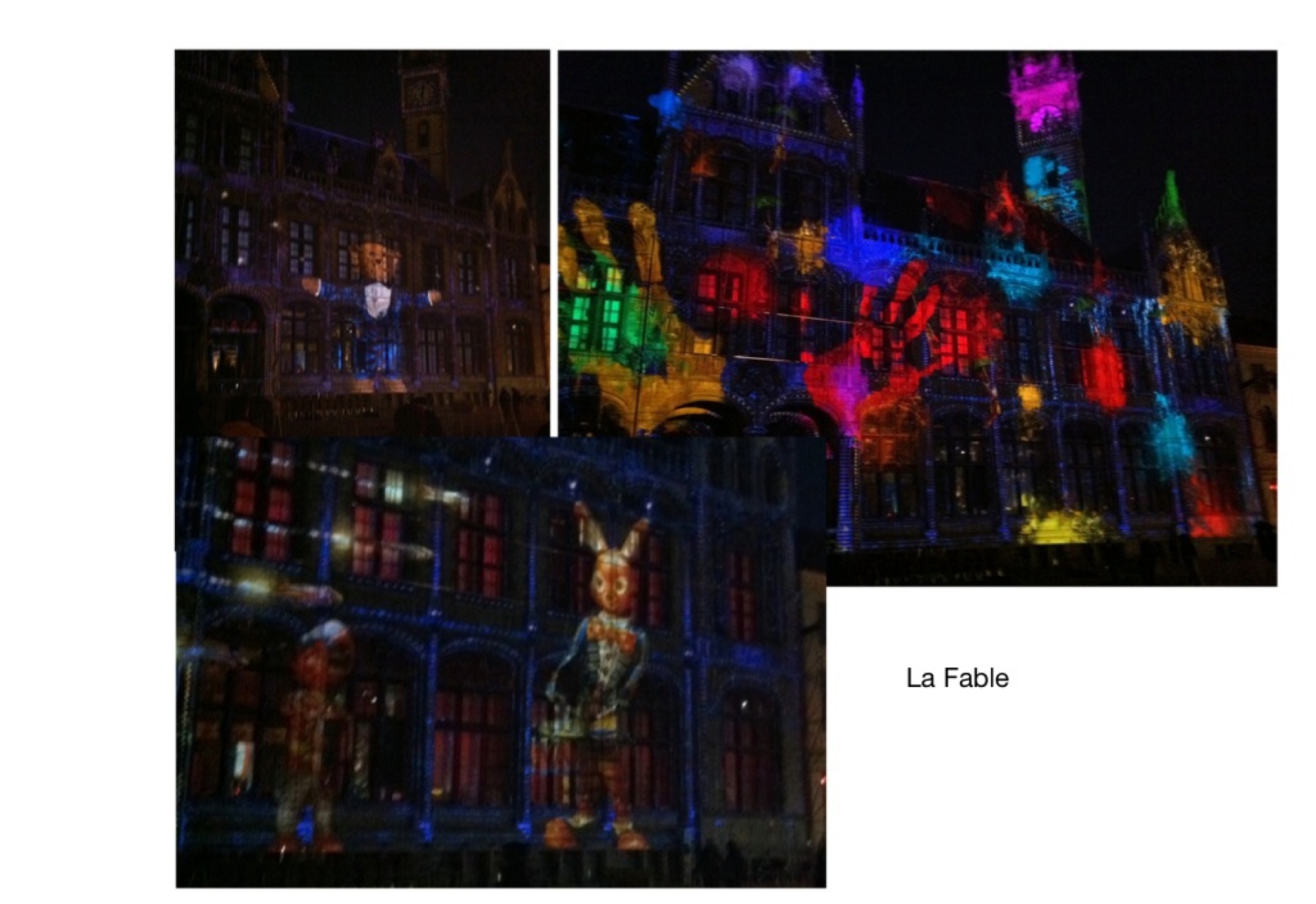 Une merveilleuse et féerique animation illustre une fable dans laquelle de gigantesques animaux en peluches et des elfes construisent, transforment, transfigurent et couvrent de taches de peinture la devanture et les tours de l’édifice.