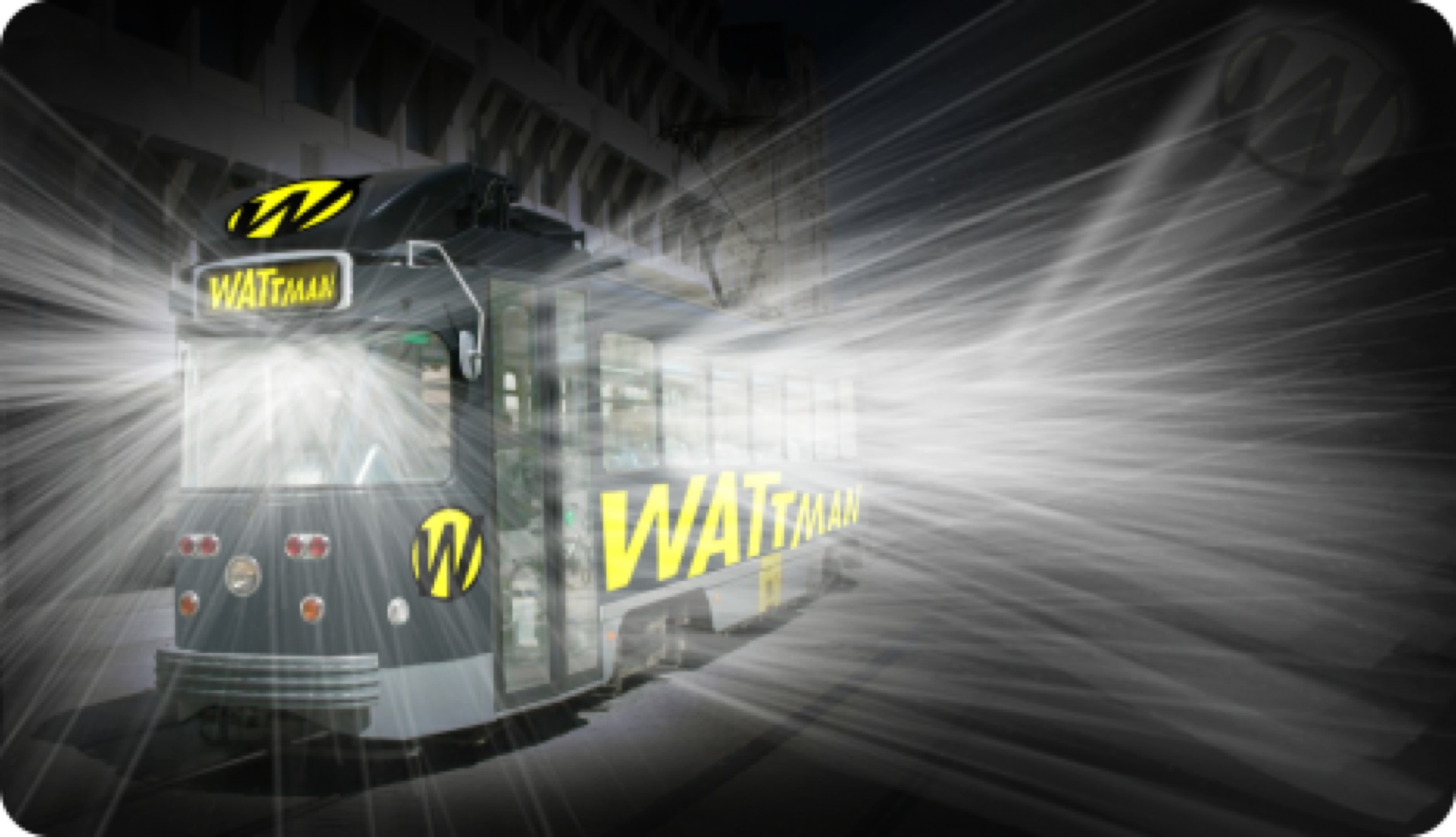 Tout en lumière et fumée, le tram fantôme noir, baptisé ‘Wattman 7’, traverse le Marché-aux-Grains. Il distrait un instant la projection animée du spectacle laser qui est projeté sur la façade de l’ancienne poste.
