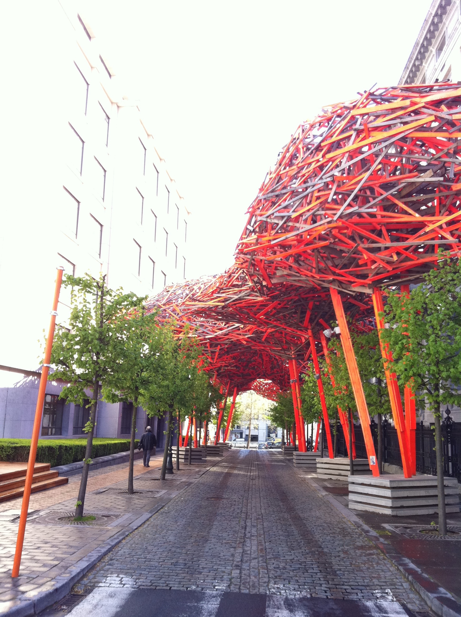 On pénètre dans la rue sous une arcade en bois et béton de couleur orange, oeuvre de l’artiste Belge Arne Quinze qu’il a intitulé ‘The Sequence’. C’est la ‘prolongation’ de sa création ‘Cityscape’ qui couvrait le terrain vague de l’avenue de la Toison D’or en 2007.