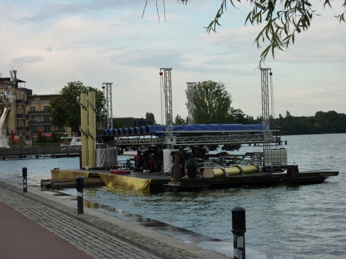 À deux encablures donc, au nord du Chat Lune, des ouvriers ont amarré un ponton flottant comportant un kiosque et une impressionnante installation sonore.