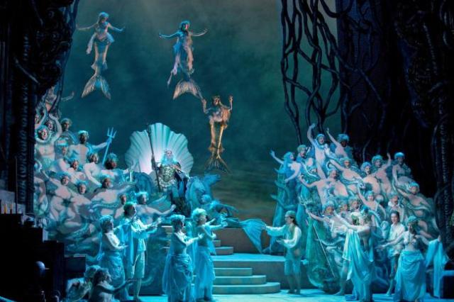 C’est plus compliqué que cela mais qu’importe, la musique baroque est merveilleuse, les chants sublimes et la technologie du décor qui combine des figures d’animaux mythique et des arbres en carton peint avec une projection vidéo de la mer déchaînée, la forêt mystérieuse et menaçante, les costumes de composition extravagants, les fanfreluches, les plumes et les couleurs en folie, le tout est enchanteur et d’un dynamisme sans faiblesse qui nous laisse surpris, lorsque le rideau tombe, quatre heures plus tard, sur les protagonistes heureux, amoureux et réconciliés.