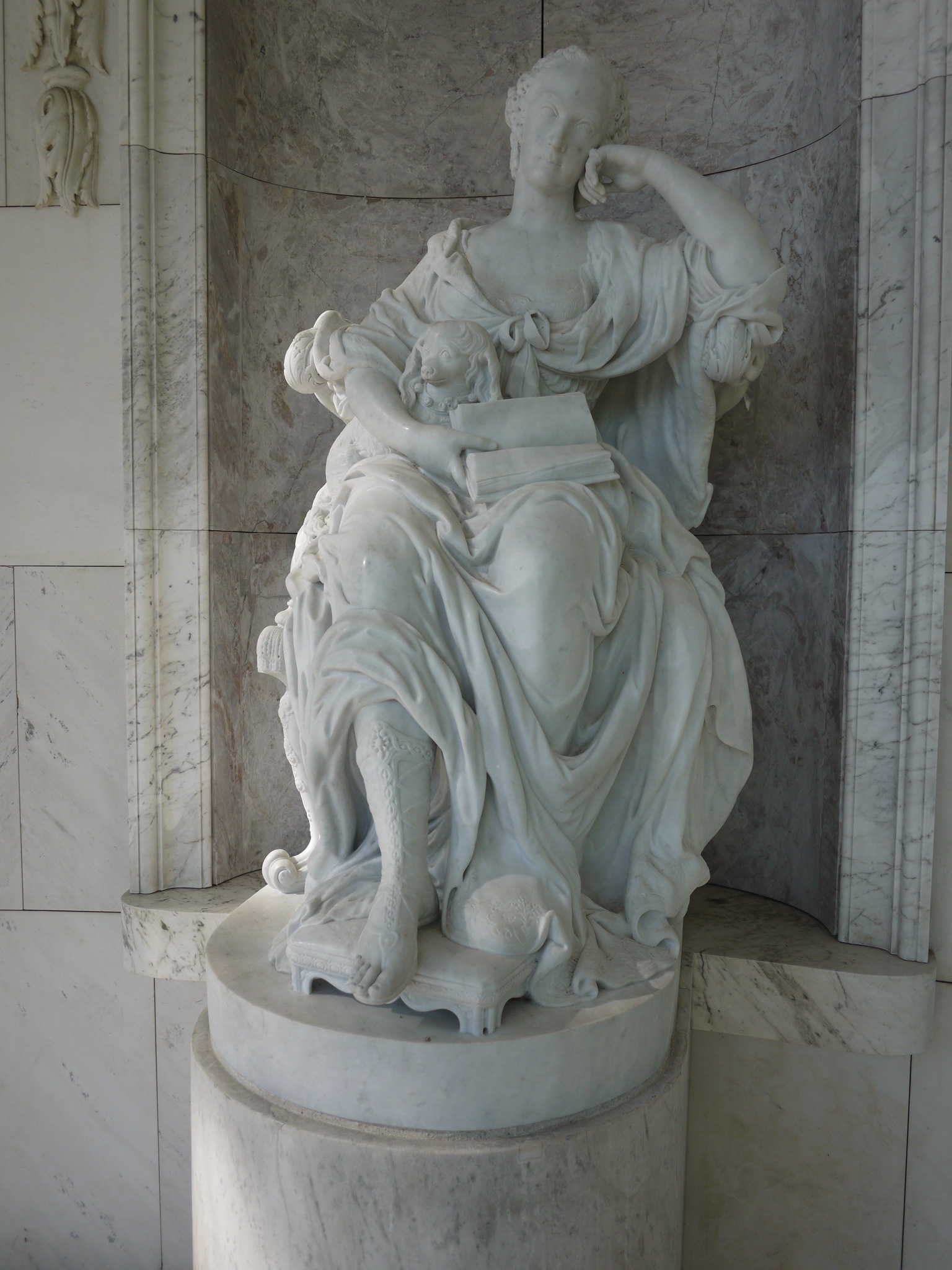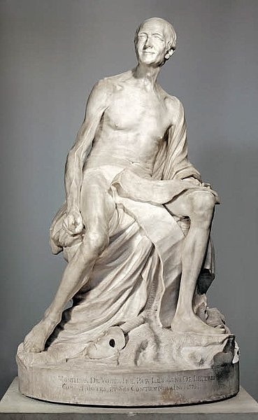 Vingt ans plus tard, le roi finança une sculpture d’un Voltaire vieux et anorexique, une plume à la main et simplement vêtu d’une feuille de papier cachant son sexe. Ladite sculpture est exposé à côté de la statue de sa soeur Wilhelmine, dont l’original se trouve dans le pavillon de l’amitié, que nous avons admiré hier dans le parc.