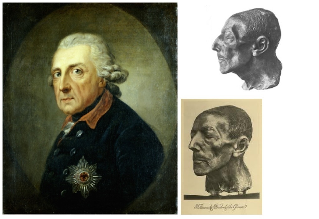 Les artistes qui l’ont représenté en peinture avaient découvert le Photoshop avant que le mot n’existe. Même Adolph Menzel à qui l’on doit le tableau du roi jouant la flute, rectifie son nez alors que le masque de mort montre clairement un appendice nasal convexe à souhait.