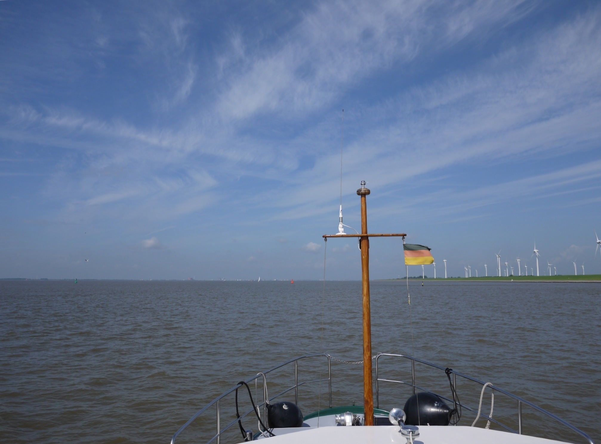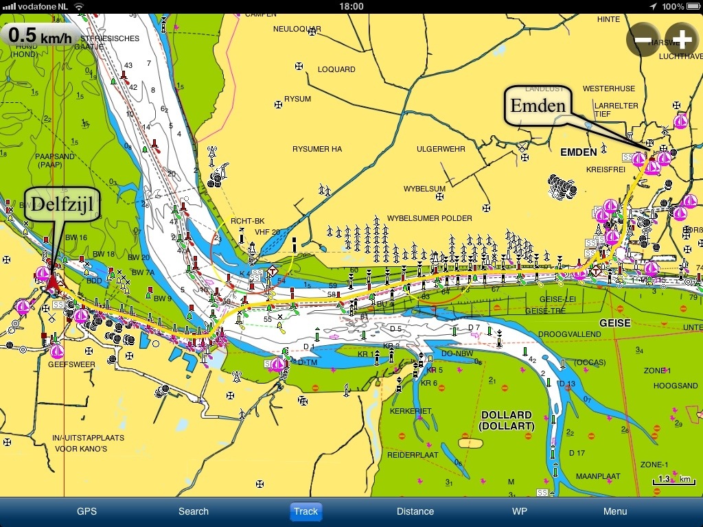 Ça demande un peu de recherche et de préparation mais cela dit et fait, les ponts s’ouvrent à l’heure et les écluses tournent au bon moment. Nous passons le pont de chemin de fer à 06:50 et l’écluse de mer de Emden regroupe les bateaux de plaisance à 08:00. Les obstacles passés, nous nous amarrons au ponton d’attente et comme son nom l’indique nous attendons la marée haute plus une demi heure, pour nous engager sur l’Ems en direction de Delfzijl. Les courants et le vent nous portent et à 11:30 nous fixons nos amarres dans la Neptunus Marina de Delfzijl, nous voila en Frise Néerlandaise.