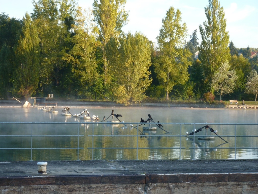 Depuis Paris nous avons vu trois martins-pêcheurs. Dans les eaux de Melun, des centaines de couples de cygnes avec leur jeunes qui ont atteint la taille adulte, mais qui piaillent et dont le plumage est brun clair. Partout et toujours les hérons vexés d’être dérangés dans leur chasse aux poissons s’envolent en huant, les canards rescapés de la saison de chasse nagent en rond ou sont assis sur une branche de bois pourrie qui sort de l’eau et nous regardent passer avec indifférence. Et puis il y a les cormorans, les mouettes et les poules d’eau, sans publier les poissons et toutes les autres bestioles qui sont là et qui nous observent sans qu’on ne les voit.