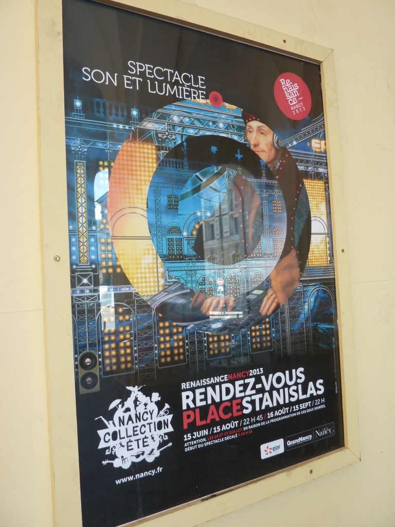Aussi, fort de cette certitude scientifique, le bateau mis en ordre, nous roulons jusque Nancy et nous sirotons une boisson fraîche sous les parasols du Café de l’Europe sur la place Stanislas en attendant que le spectacle son et lumière offert journellement par la ville nous ravisse. Les images sont projetés par des rayons laser sur la façade de l’Hôtel de Ville et sur les façades latérales. Elles retracent sommairement l’histoire de la place en y rajoutant des éléments ludiques. Il y a peu de commentaires, la musique donne la mesure de la succession des tableaux, le public venu nombreux en cette chaude soirée d’été apprécie et applaudit bien fort, nous aussi.