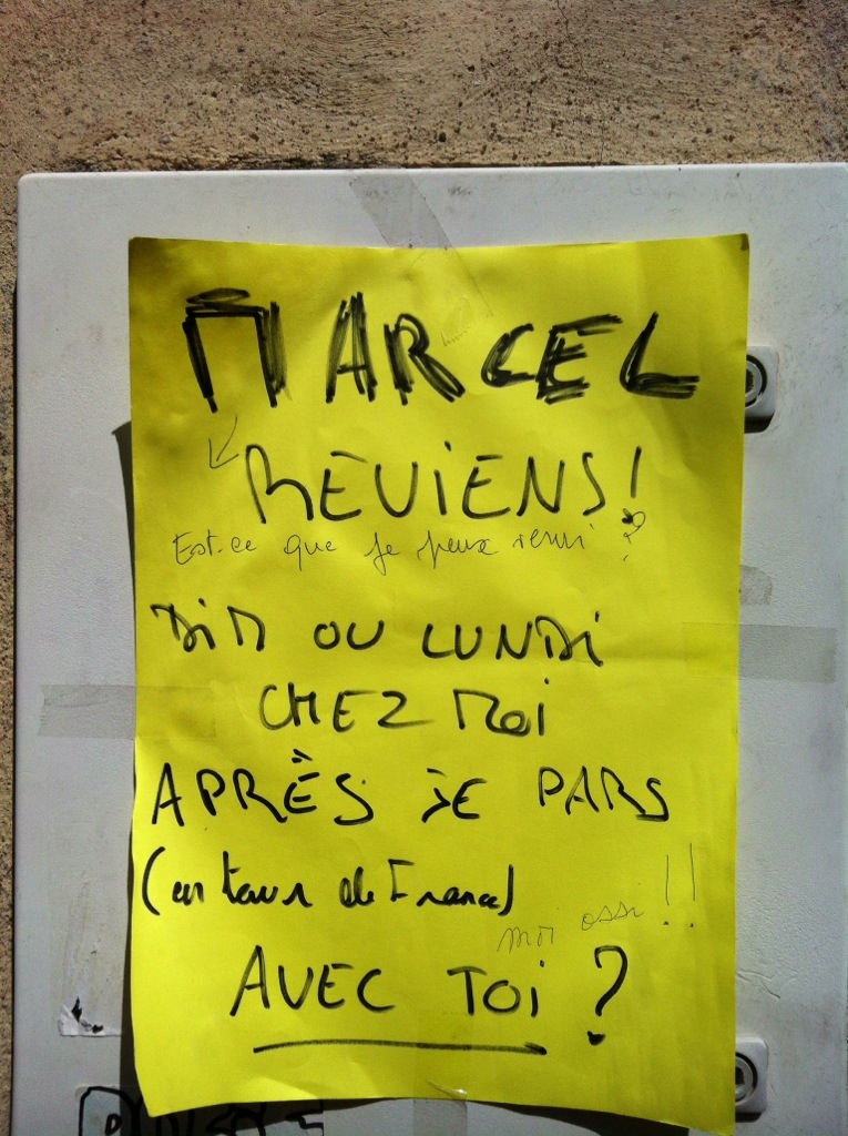 À l’instar des appels de propriétaires de chats en cavale, ci et là dans les rues du vieux Nancy, une affiche d’un jaune criard incite Marcel à revenir. Le message est légèrement menaçant, si Marcel n’est pas revenu dimanche ou lundi, la personne qui a collé l’avis part faire un tour en France, avec ou sans Marcel.