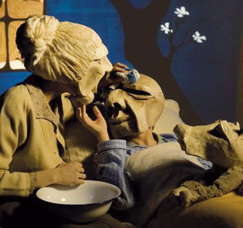 Les acteurs portent des masques surdimensionnés, le chien est une poupée.