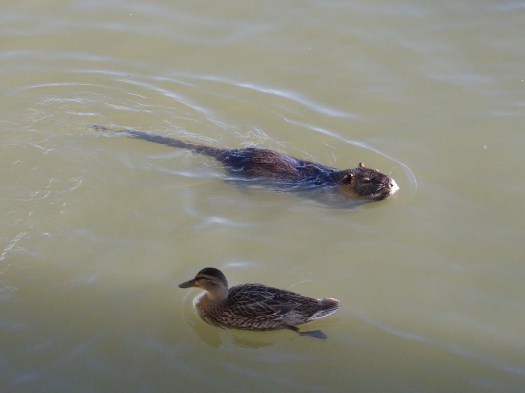 Le ragondin aime le pain et chasse les canards pour avoir son morceau.Ce n’est pas un rat mais une espèce de castor originaire d’Amérique du Sud, importé au 19ème siècle. Il ne supporte pas le froid car sa queue gèle et alors il meurt de gangrène. Il peut peser jusque 9 kg avec un corps de 60 cm et une queue de 45 cm. Il possède quatre grandes incisives de couleur orange avec lesquels il fait des dégâts dans les berges des canaux. Pour cette raison il est classé parmi les animaux nuisibles.