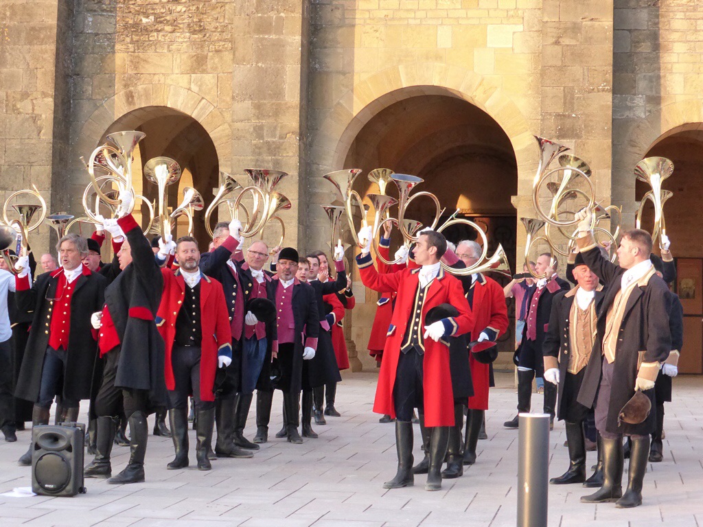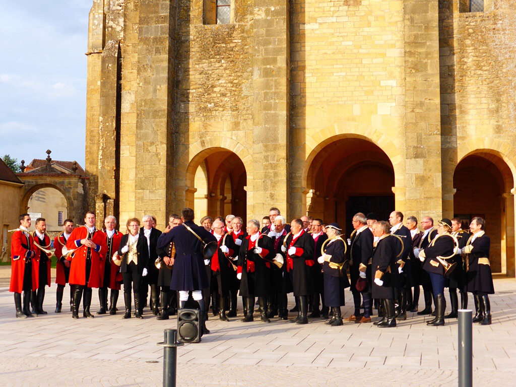 Ils portent tous l’uniforme de leur confrérie, de la redingote rouge vif à la noire, bordée d’or. Le spectacle se donne sous le soleil couchant de la première journée d’été qui peint d’une couleur dorée le fronton de la cathédrale. Le public nombreux de tout âge, nous inclus, apprécions le concert et nous rentrons au bateau le cœur et la tête plein de sonorités de vénerie.