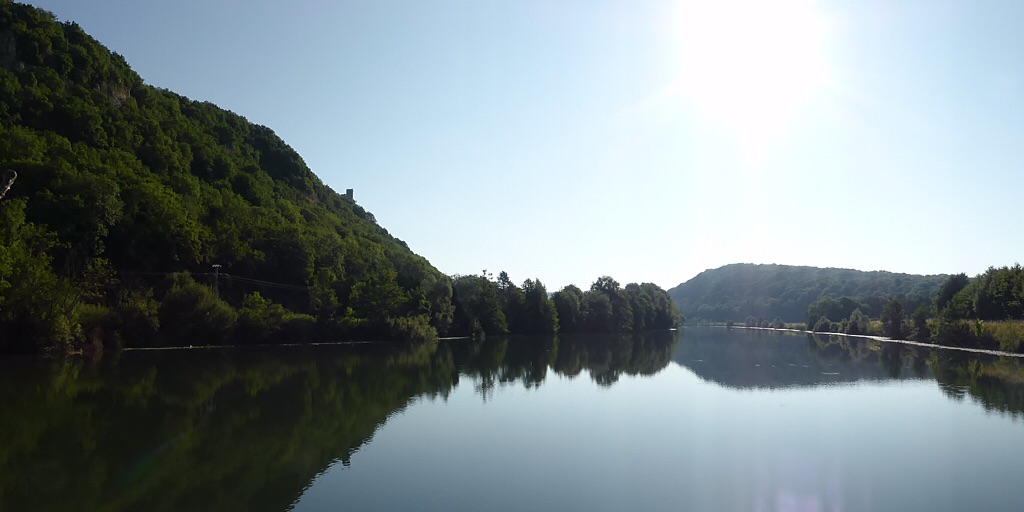 En 2014 nous remontions le Doubs dans l’idée d’aller à Mulhouse. Après le demi-tour à Montbéliard comme je l’ai décrit dans un de mes billets précédents, nous sommes revenus ici. La rivière était en crue, il pleuvait des cordes, pour aller voir le feu d’artifice nous avions revêtu nos vêtements de grandes eaux. Aujourd’hui, le niveau de l’eau est bas, les grosses pierres des barrages sont apparentes et un avis à la batellerie interdit la navigation aux bateau dont le tirant d’eau est supérieur à 1,70m.