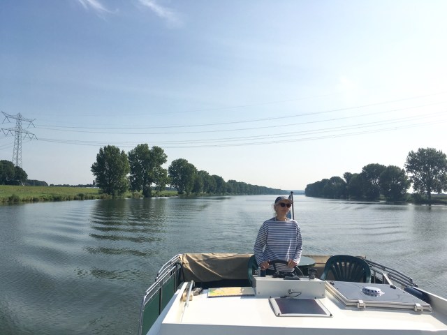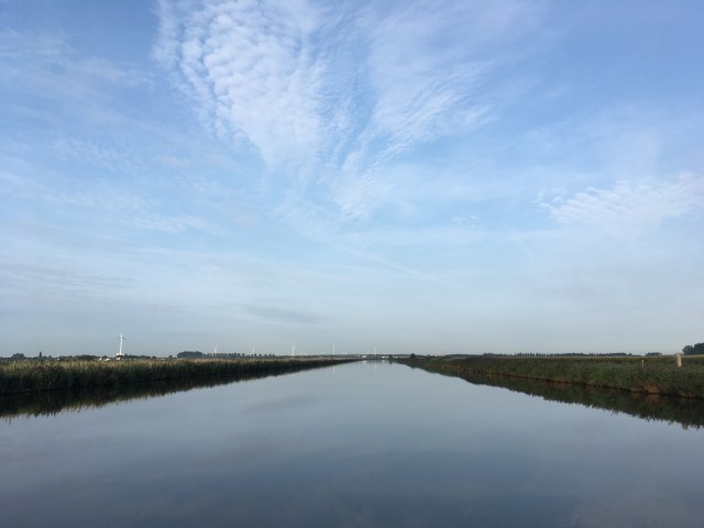 Quelle différence que de se retrouver sur un canal sans courant et sans vagues. Même sur la Meuse que nous rejoignions plus loin, nous avons l’impression de voguer sur un lac par temps calme. Le paysage se déroule lentement, de temps à autre on croise et on se fait trémater par une péniche. Ici et là une marina, un moulin à vent, une ferme. Comme sortis par enchantement, apparaissent de nombreux bateaux de plaisance. C’était l’exception sur le Rhin.