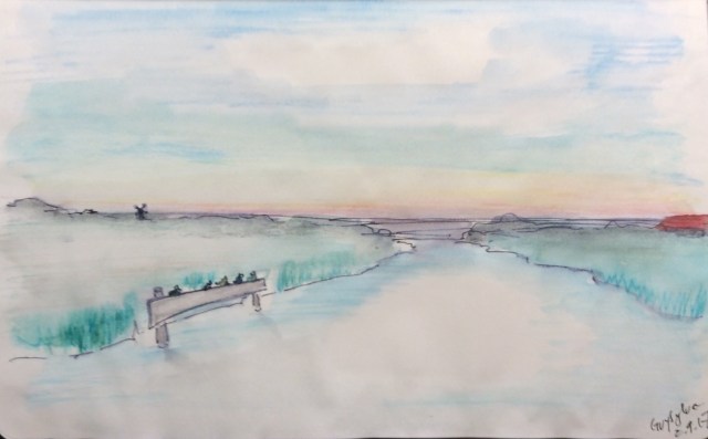 Le lendemain, sur le Mark, la rivière qui traverse Breda et qui change de nom pour devenir le Dintel avant de se jeter dans le Volkerak, nous amarrons notre bateau à un des nombreux emplacements sauvages prévus pour nous. Deux poteaux et quelques mètres de planches font office d’amarrage pour l’après-midi et la nuit. Dans l’absence de bateaux, les canards en prennent possession. Entourés de champs, nous sommes seuls au cœur de la Hollande. Au loin, on aperçoit le toit d’une ferme. Pas d’autre bruit que le chant des oiseaux. Ni train, ni voitures, ni avions, ni festival. Quel bonheur.