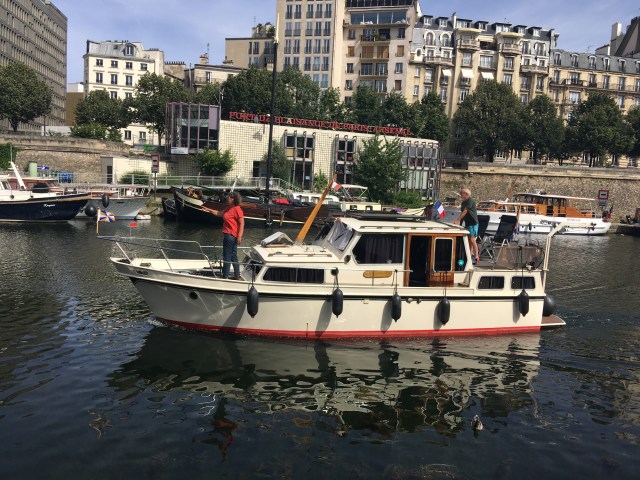 Au port de l’Arsenal, le DJ de la place de la Bastille et celui du Pont Morland se font une concurrence, on entend l’un ou l’autre selon que nous ouvrons les hublots bâbord ou tribord du Chat Lune.